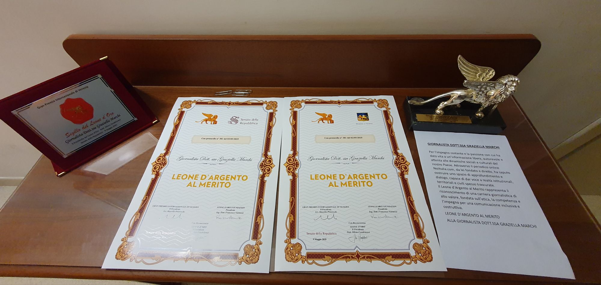 CONSEGNATI ALLA GIORNALISTA GRAZIELLA MARCHI, IERI A ROMA, BEN 4 RICONOSCIMENTI AL MERITO: IL “LEONE D’ ARGENTO”, LA TARGA, E 2 PERGAMENE DI “RICONOSCIMENTO AL MERITO”.